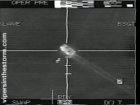 A bright white object appeared on the left side of the screen. The Maverick missile struck the left rear of the APC, which disintegrated. A fireball of white light filled the screen as molten pieces of hot metal rocketed skyward. This was the first time any of us had seen such a vivid picture of death."Splash the mover," Stitch radioed calmly. | |
